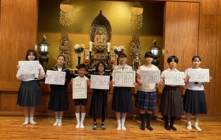 | 名付け賞2名受賞!! 上之宮太子賞 氏本紗綾さん(中3)課題「和顔愛語」 毎日新聞社賞 林 條仁くん(小2)課題「天上」 秀作賞6名受賞 山本優奈さん(小5)課題「雲海」 林 美伶さん(小6)課題「雲海」 谷川由香里さん(中1)課題「和顔愛語」 谷口 絢さん(中2)課題「和顔愛語」 瀬尾虹帆さん(中3)課題「和顔愛語」 千原那奈さん(中3)課題「和顔愛語」 |