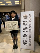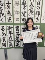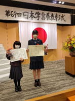 | 特別賞3名受賞!! 最優秀賞 増井 萌衣さん(小4) 日本教育書道研究会賞 南坊城 日向子さん(小4) 安斎 彩月さん(中3) ![]() 令和7年4月12日にシティプラザ大阪で表彰式が 執り行わました ![]() |