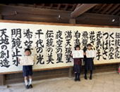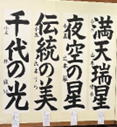 | 東京市千代田区日本武道館に於いて新春1月5日予演会を通過した14名の 生徒さんが席書き本番に挑戦しました。 特別賞2名受賞!! 東京新聞賞 菅谷 智恵 先生(一般)旧制 阿部 審査員奨励賞 辻本 翠さん(小5) ![]() ![]() ![]() |