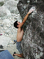 素手でトライしようとしたが、岩の硬さに負けてテーピングをする。