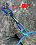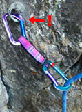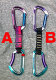 クイックドロー(以下ヌンチャク)には連結する場合を除き、通常カラビナを2枚使う。 ボルトにクリップする側がストレート・ゲートで、ロープをクリップする側をベント・ゲートにするのが 通常のスタイルだと思う(さらに言えば変型D型のデザインのものが主流だ)。 しかし、ゲートの向きを揃えるか、反対にするかは人それぞれだと思う。【写 真−1】 反対(A)にする方がシンメトリーで、見た目のバランスはいいかもしれないが、 私は以下の理由からゲートを同じ向き(B)にして使っている。 写