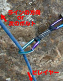 写真−4ユルユルで動いているボルトならともかく、しっかり打たれたボルトなら、多少テコの作用が 働いたとしても、抜けるようなことはないだろうが、気分的に良くないし、 カラビナに変な力が作用して最悪の場合、破断することもあり得る。 Bのようにゲートの向きを揃えておけば、アゴが岩に当たってしまうこともなくなる。【写 真−4】 今までこの方法で不都合は感じていないが、いかがであろうか。 |