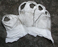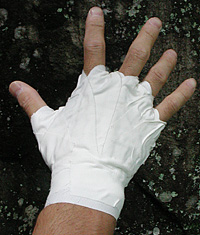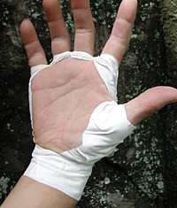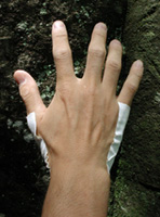 | 今回は、クラック・クライミングで使う「テーピング」のティップ。 鈴木英貴氏のような達人ならいざしらず、私のような凡人には痛みから守るテーピングは必要不可欠なものだ。 しかし、丁寧にテーピングをするほど、その消費量が増えてしまう。 例えば、小川山に4、5日滞在し毎日クラックを登ったら、テープを何本も用意しなければならないだろう。 そこで、ここに紹介する方法は、4、5日の使用なら充分使える巻き方だ。 雑誌等にも紹介されたことがあるので、すでに知っている方もおられるだろうが、 今一度この方法を見直しては。 ☆☆ メリット ☆☆ 1.繰り返し使えるので、経済的。ゴミも少なくなる。 2.手の甲を効果的に保護し、手のひらのフリクションが犠牲にならない。 抜け口のスローパーも安心。 3.2回目からは巻く時間を大幅に短縮できる。 ★★ デメリット ★★ 1.最初、丁寧に巻かないと長持ちさせるのは難しい。 2.丁寧に巻く必要があるので、初回は巻くのに時間がかかる。 3.手のひらが弱い人は、痛みを感じるかも。 |