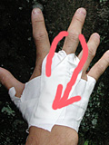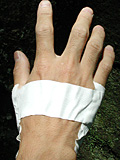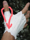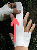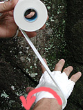 | 3) これから各指に巻いていく。 右手の場合で説明する。 テープを25cmほどで切る。 手首にテープの端を付け、 人差し指と中指の間に通し、 中指と薬指の間から、 最初のテープの端まで丁寧に貼っていく。 (写真4、5) |