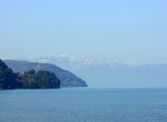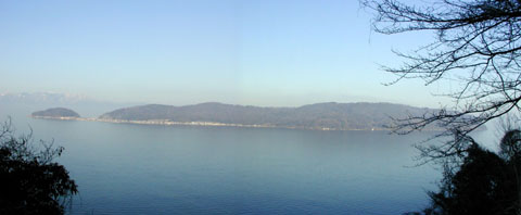 JR近江八幡駅からバスで約20分で長命寺港終点。風もほとんど無く快晴の天気。車道を歩き始めるとすぐに左手に雪をかぶった比良山系が見える。朝日に輝きとてもきれい。歩道もない道路だが車の通行も少ないので気分良く歩ける。しばらく行くとシャレー水が浜。しゃれたペンション、レストランがある。樹木に囲まれた道路をてくてく歩く。所々で材木を運び出す作業場がある。また水も良いのかもしれない。長命水と表示されたわき水もある。湖上には大きな沖島が見える。1時間ちょっとで近江八幡国民休暇村に着く。西館、東館があり東館が新しいようだ。東館の前には広い砂浜が広がり、水の上には鴨の群もいる。ここは湖西の志賀町を起点とする約140kmの「近江湖の辺の道」の終点という標識がある。砂浜からは左手に比良山系、正面に沖島、右手に伊崎と見渡せ、良い景色である。しばらく行った右手の駐車場に超望遠レンズをつけたカメラマンが10名近く?山の上の被写体をねらっている。よほど珍しい鳥?でもいるのか。そこから登り、下ると沖島への船便の発着がある堀切港。続いて田園地帯に出ると湖の辺の道の標識があり伊崎不動に向かう。入り口からはハイキング道らしく山道の地道がびわ湖にせり出した半島の先端まで約1km。伊崎寺(伊崎不動)は田舎の寂れたお寺であるがなかなか立派なものである。その横手から毎年、テレビなどで報道される湖上に突き出た竿からびわこに飛び込む竿飛堂に行ける。そばまで行ってみるとなかなかスリルのある事がわかる。引き返して入り口から左折して湖岸沿いの堤防の上の舗装道路を行く。広い砂浜があるが地図を見ても名前がない。もともと大中の干拓地だからか?。広々とした景色で公園などの整備もされておりゆったりとした気分になれる良いところだ。水車橋を渡り能登川漁協センターの横を通って湖岸を行く。ガイドにあった栗見出在家の弁柄格子塀?わざわざ見るために遠回りをすることはない。愛知川橋をわたると新海浜(しんかいはま)。道標に従うと田圃のあぜ道のような道を抜けて湖岸沿いに出る。予定の新海バス停まで行くと土日はバスが無い。仕方がないので約6kmの道を稲枝駅まで歩く。