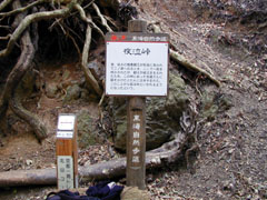 (京都一周トレイル北山東部2) 戸寺バス停はセブンイレブンの前である。すぐに高野川をわたり集落を抜けて山道に入ったと思うとすぐに江文峠。アスファルト舗装の車道を横切り山道に戻る。また車道と交差して静原。名前の通り静かでのどかな山間の集落である。民家の間を抜けてコンクリートの急坂を登り薬王坂、途中の大木の根元に弥陀二尊板碑という石碑がある。1364年とかいうたいそうに古いもの? 坂を下ると鞍馬にでる。鞍馬から二の瀬まであまり広くない車道で交通量も多く、ひやっとしたり歩いて楽しくない。 (京都一周トレイル北山西部1) 二の瀬駅手前を右にはいると北山西部1コース・夜泣峠に向かう。東海自然歩道の標識が整備されていてわかりやすいが一部に方向が90°ずれているのではないかと思われるものがあった。急坂を登って夜泣峠。西方向に少し展望がひらけているのでここで昼食休憩。峠を下ると雲ヶ畑街道大岩バス停に出る。山幸橋まで舗装道路を行く。橋をすぎたところで右に折れて山道に入り盗人谷?丸太の橋をいくつか渡りながら小峠への急坂を我慢していく。小峠を下ると氷室の集落。ここも静かな山里でゆったりとした気分になれる。舗装道路を京見峠まで行くが1台の車にも出会わない。京見峠からはその名の通り京都の町並みが良く見渡せる。大文字山から東山もよく見える。道標68からは松茸シーズンの9月25日から11月10日までは通行不可になっている山道になり上ノ水峠へ。上ノ水峠で今日の予定終了し鷹峯へ下る。鷹峯で道を間違え?(道を尋ねようにも歩く人もいない)金閣寺前まで歩いた。 (2004/3/27(土) |