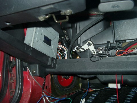 | まず、助手席側からチャレンジしました。 通す配線は2本です。 車内側の配線の出口を出すためにグローブボックス、 コンピューター、スピーカーカバーの順に外します。 コンピューターは配線を2つ共ソケットから抜き、ボルト 2つ外せば取れます。 |