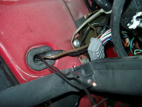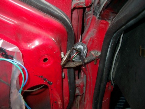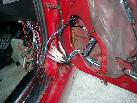 | 次にドアの内張りを外します。 (オートパワーウインドウの取り付け参照) 配線は、ドアの付け根から車内側に通す為、純正の パワーウインドウ配線が入っているゴムチューブをドア側 から引き抜きます。 通常は窓の配線が2本入っているだけです。 このチューブの入り口からシリコングリスをたっぷり噴き入れ ます。 そして適当な長さの配線を2つ折りにし車内側に突っ込み ます。 すると配線はボディーと内張りの間にはまり込み車内には でませんが多めに押し込みます。 |