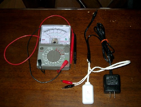 | テスターと12V電源です。 汎用の12V 2AのACアダプターを分岐しコタツのスイッチ でON-OFFできる構造にして先端をワニ口クリップを 取り付けました。 まあ2Aあれば大抵のものはチェックできます。 特に動作確認といっても光物(EL、LED、電球)が殆んど ですが! |