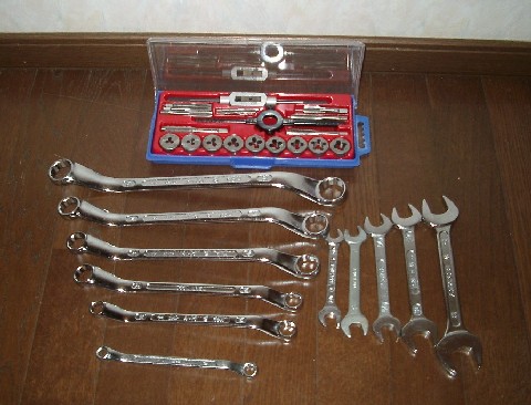| 上からダイスとタップのセット。用途は低い。 左6本メガネレンチ。サイズは24〜8まで。 右側はスパナ5種類です。 これだけあればたいがいOKですが場所によって S型メガネがあった方が良い時もありました。 |