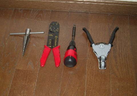 | 上からホイル外しにパワーの掛かる1/2インチレンチ。 中段左から、ニッパー、ラジオペンチ4種類、六角レンチ 下プライヤーと細線の皮むきワイヤーストリッパー。 |