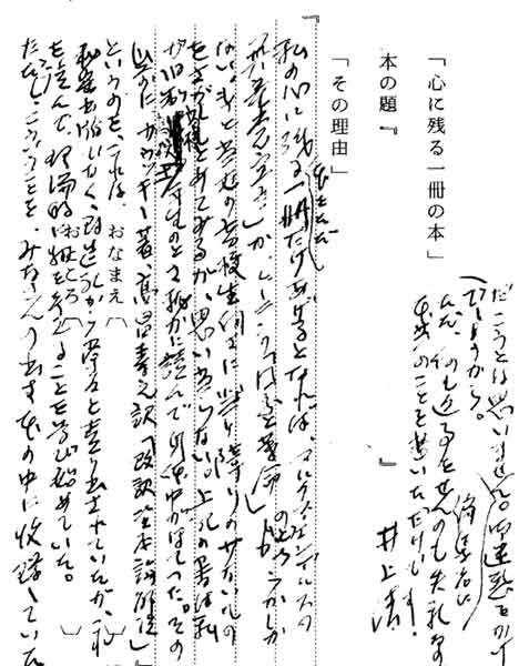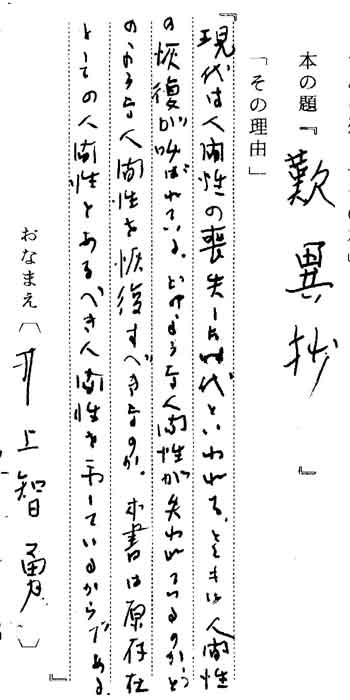 | テキスト: 008Q*井上智男(明39)京大名誉教授 西洋史 「歎異抄」(岩波文庫) 『現代は人間性の喪失した時代といわれるとともに、人間性の恢復が叫ばれている。どのような人間性を恢復すべきなのか。本書は原存在としての人間性と、あるべき人間性を示しているからである』 |