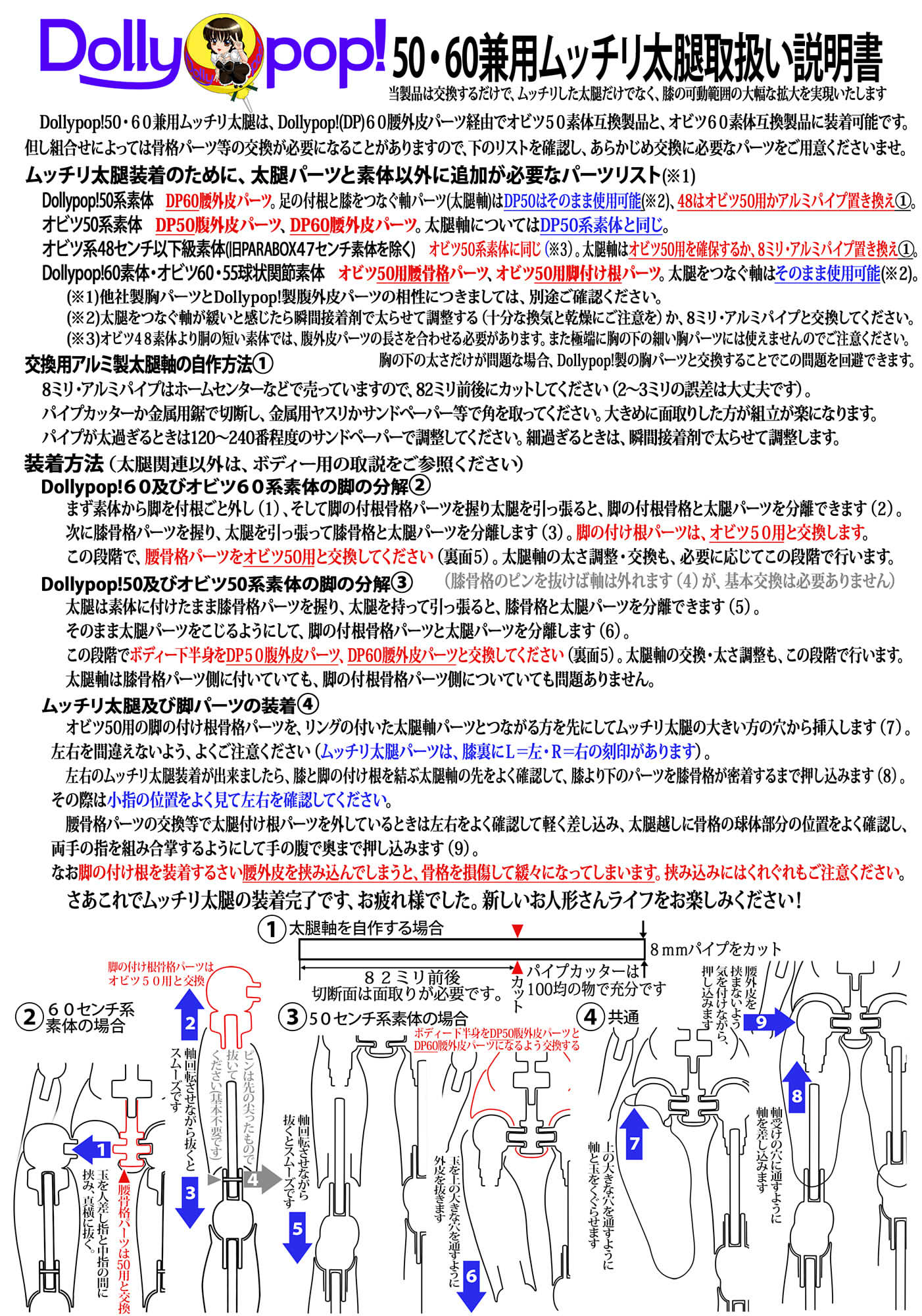 具体的なパーツの交換の仕方は取扱説明書に任せるとして、この店頭用ポップ画像では、組み換えに必要なパーツと必要な加工などを簡単に解説しております。画像内では50センチ素体+ムッチリ太腿で『50センチセクシーダイナマイトなボディー』となっていますが、大体53センチ相当位のイメージになります。ムッチリ太腿インストールの詳細につきましては、製品の紹介にも解説があります(書いた本人も、その事実を忘れてました)。