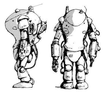 そして、以上4つの仕様のうち、1と2は絶対必要条件、3は必要条件、4は実現が望ましいという条件とされた。まず1であるが、現在傭兵側の兵器でナッツロッカーを撃破することができるのは、大型のロケットランチャーを装備するドールハウスのみであるが、あのような大型のロケットランチャーをAFSに取り付けるのは不可能である。それから、2.これは捕獲した敵PKA及びナッツロッカーの装備する特殊耐熱セラミック装甲を模倣生産し、装備することで解決できそうである。残る3〜4はこれまでのAFS Mk.I、Mk.II製作の経験を下地に、なんとか実現できそうである。問題は1である。しかしこれも、先のC.W.3.8ミクロン中間赤外線レーザーを開発したゲルツェン博士によって解決された。博士は臭化水銀を原料とするエクサイマー高出力レーザーの小型実用化に成功したのだ。このエクサイマー高出力レーザーは0.5ミクロン波長の超紫外線で、大気穿貫性が強く、敵装甲板を衝撃で叩き破るものである。エクサイマー高出力レーザーを発射するPrg.56レーザーガンを備え、ナッツロッカーの高エネルギーレーザーカノンに耐える特殊耐熱セラミック装甲に身を包み、高出力のエンジンを搭載したスーパーAFSは2884年12月10日から生産に入った。以上のように優秀な性能を持つスーパーAFSはもうひとつ全く新しいシステムを導入していた。従来のAFSの防御における最大のネックであった覗き窓を廃し、テレビカメラによるオプチカルシステムを採用したことである。これは、戦闘服の頭部にある伸縮自在の複数のカメラによる映像を、射撃データーなどと共に、直接視神経に送り込むと言う、後の装甲戦闘機ファルケにも採用されている、画期的な間接視認システムを備えた。 2884年12月25日、先行生産型の4機はパトロール中のナッツロッカー2機を捕捉、一機を完全に撃破し、その性能の高さを証明した。また、この時ナッツロッカーから直撃を受けた2機のうち、1機はオーバーホールによって、またもう1機は被弾部分の交換のみで戦列復帰し、搭乗員も無傷であった。傭兵軍司令部はSAFSを最優先生産兵器に指定し、拡大生産体制にはいった。 (HOBBY JAPAN 別冊より) | |||||||||||||||||||||||||||||