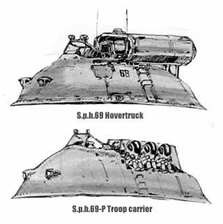 イ)HJ82/9 (作)- シュトラール軍、大型装甲ホバートラック。2884年に新型の装甲輸送車輛として就役したもので、不整地走破性、操縦安定性、メンテナンスの簡便性から多くの部隊で活躍した。後部の荷台部は用途に併せて様々なタイプがあった。P.K.A.就役後は、装甲戦闘服用の兵員輸送車に改造されたS.p.h.69-Pの生産が開始されている。これは、後部の荷台部分に合計6機のP.K.A.を搭載できるようになっている。 |