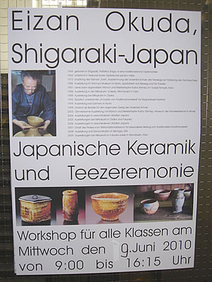 ドイツ・バイエルン州と滋賀県の経済交流活動の一環として、2010年6月7日〜19日、バイエルン州立ランズフット陶芸専門学校で作陶のワークショップ、ダッハウ旧給水塔にて、奥田英山作品と森野すだれ店びわ湖ヨシの作品の共同展覧会が開催されました。 さらに、裏千家ミュンヘン協会と私の合同でミュンヘン市内中心にある英国庭園内お茶室にて茶道のデモンストレーションが行われました。各所で多くの方に信楽焼についての関心を高く持っていただき、プレスでも報道され、大変有意義な催しとなりました。 |