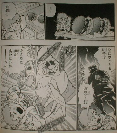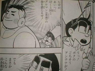 | 今回は 転校生の新キャラが登場します。 連載マンガ等において、手軽に人気を得るために安易な手法で改善を図る回を「テコ入れ回」と呼び、それはあまり誉められたものではないと聞きます。 毎回毎回、それはもう新キャラが出てこない回の方がめずらしい テコ入れっぱなしマンガ「グルマンくん」。 常にテコ入れしているため、誰もそれをテコ入れと気付かないほどです。さすがゆでたまご先生! 斬新すぎます。 目からウロコが溢れてきて、ウロコを拭っても、拭ってもウロコが溢れてきてウロコが止まりませんでした。(西山文雄先生の「実話・辛くて悲しい運命」より抜粋・改変)(←オススメ電波物件) 気取先生「なんとわがクラスに転校生がやってきましたーっ!!」(ステップステップミソンバミソンバ)(←効果音です) 河馬野「わー内田有紀ちゃんみたいなカワイイ子だったらいいな!」 ミリン「ウウン武田真治くんみたいな男の子なら大歓迎よ!」 腹田「わたしはジャック・ニコルソンね」 (゚з゚)・・・ しかし、みんなの期待を裏切って、転校生は太った男の子でした。