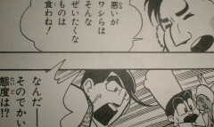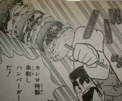 耳カバーつけながらノースリーブのシャツに半ズボンのいでたちの彼。 寒いのか暑いのかハッキリしろというツッコミはさておき、 東北地方に住んでらっしゃる方に質問したいと思います。「東北からきました」って言い方します?? 東北地方は十把ひとからげですか? まあ、これだけだと、セリフをねじ曲げた解釈で無理矢理ツッコんでるだけの、ただのアゲアシ取り・重箱の隅つつきに見えるかもしれません。 しかし、今回はこの他にも東北地方に対する偏見としか思えない問題発言が随所にポロポロポロポロ出てくるのです。 今回は 普通のストーリー紹介に加え、地方蔑視っぽい描写にも着目していきたいと思います。 まず先にストーリー紹介を済ませます。 さて、転校生の自己紹介も終わったところで、今日は水曜日。恒例の弁当バトルの日です。 確か第1話で、誰もが豪華な弁当を用意できるわけじゃなかったんだとか反省してた気もしますが それは気のせいですので気にしないようにしましょう。悪魔超人には記憶力の欠如が必要ってサンちゃんも言っていました。 さあ! お待ちかね、銀座のフランス料理の名店モキシムの御曹司でぼくらのヒーロー味本魚菜くんの料理は・・・ ただの豪華な懐石料理の弁当。 ・・・・・・・・・こんなものが子どもたちのヒーローウルトラライダーや関西国際空港弁当という人類史上に残る素晴らしい弁当と同じ人が作った弁当だなんて、信じたくありません。 読者なめてんのか? 金かえせ! 正直、こんな味本くんは見たくなかった・・・。フランス料理ですらないよ? キャラが全然立ってません。 対する弁当バトル優勝常連もう一方の雄・天才グルマン食井カンロの料理は・・・ カンロ特製串刺しハンバーガー。 ![]() ・・・・・・・・・正直、めっちゃ食べにくそうです。読みきり「食い倒れ野郎」のネタ使いまわしだし。 読者なめてんのか? 金かえせ! そんなこんなで今回の弁当バトルは、転校生田力くんの コシヒカリとあきたこまちのブレンド米を羽釜で炊いた米と日本海の海水から作った天然塩で・・・ ええと要するに「ただのおむすび」が優勝します。 読者なめてんのか? 金かえせ! 誰もそんなリアル志向はこの漫画に求めてないから! ところで、田力くんの家は両親とも働きに出ているため、田力くんは幼い妹を小学校に連れてきています。この現代の日本でそんなバカな。というツッコミはさておき、 おそらく毎日家事を手伝い両親を助け、小さい妹の面倒を見ながら学校に通う田力くん。ニコニコ礼儀正しく、転校先でいくら馬鹿にされても眉ひとつ動かさない非常にデキた小学生です。 が! ここで例の「ライバル悪党化現象」が発動。田力くんの性格がイキナリ変わります。 「そんなに肉が食いたいかーーっ!!」(←クリック) 虐待!幼児虐待やでぇ!通報せな!気取先生ちょっとくらい働いて! その様子を見たカンロくんは燃えます。熱い正義のグルマン魂を持つ食井カンロは田力の横暴が許せません。 ついでに今日の負けも無かったことにします。 「田力くん やはりボクはキミに負けを認めるわけにはいかない!」 それはお前が決める事じゃないだろう。 小学生はよく鬼ごっこで鬼につかまっても「バリア張ったからセーフ」とか言います。(バリア使用回数:無制限) それに近いですね。しかしそれは低学年で卒業するべきだと思います。 怒りに燃えるカンロは 田力くんに改めて一対一の料理バトルを挑みます。テーマは田力くんの得意分野・「ご飯」!! さすが天才グルマン! 相手の得意分野で勝負を挑むなんて、かっこよすぎるぜー! 一方、自信まんまんの外道・田力!