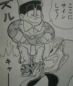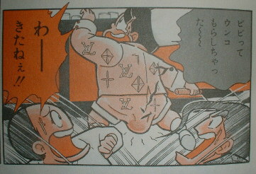 ゆでたまご先生はグルマンくんに限らずあらゆるマンガで頻繁に「取ってつけたような その回限りの設定」を披露されます。いままでそんな伏線は全く張ってなかったのに唐突に変な設定がポンと生まれて、しかもその回に使われた以降その設定が生かされることは一切無い!ってやつです。 ほんーーーのひと握りだが他のゆでマンガから例を挙げると、 「キン肉マン」では「正義超人はお互い握手することが多いから手に友情の握手ダコができている」と かなり後半になってから急に言ってみたり、 「闘将!!拉麺男」では「美来斗利偉拉麺男(主人公)は実はクローン人間だった!」と かなり後半になってから急に言ってみたり。 ・・・本当にキリがないのでこの辺にしとく。 ちなみにゆで世界の「クローン人間」とは腐乱死体を4つ合体させて作った人造人間のことで心臓も4つあります。無茶すぎてこっちの脳が腐りそうです。 今回のグルマンくんでは「カンロくんは生きた魚がこわくて触ることもできない」でしたね。 もちろんこの設定は(今回克服したことも含め)今後一切生かされることはありません。 要するにゆでたまご先生は一度作った設定を後々にも生かしたりするのが壊滅的に苦手なんです。 どんな漫画家だ。 さりげなく田力雪男は標準語の解説役になってるし・・・。 そんな先生が、ついに! ついに伏線を張り、オチもつけ、 その後ずっと覚える事ができました。おめでとう! pめでとう!(続く) |
