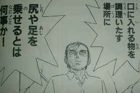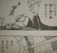| 前回、わざわざまるまる1話使って“無敵の和食の超人vs天才小学生グルマン”の夢の対決のお膳立てが整えられました。 今サラな上 クドくて申し訳ないですが、この「グルマンくん」は一応料理マンガです。 主に 口に入れるものを調理いたす過程を描いたマンガです。 ![]() (「覚悟のススメ」 より。) ![]() 尻や足を乗せるどころではありませんでした。 葉隠覚悟さんに見つかったら加速削減走を食らわされるかもしれません。 もう「夢の対決」なんてどうでもいいですね? 少なくとも俺はもうどうでもいい。なんか腹も立ってきた。ゆでたまご先生がウンコとかオシッコを作品に取り入れるのが大好きなのは有名です(「スクラップ三太夫」の「ウンコマシンガンでゴワス」他多数)が、まさか料理マンガで、しかもあろうことか厨房でウンコとは…いったいどういうつもりで描いたのか本気で知りたいです。 この勝負でカンロが作った料理は、サクラ鯛のダイナミックたき火焼き。 この料理、生きた鯛が泳ぐ小型水槽に直接しょうゆと生米をブチ込んで殺し 蓮の葉でつつんで十分焼いて作ります。汚い。ダイナミックにも限度があります。 あ、「じゅうぶん」焼いたんじゃないよ。「じゅっぷん」。10 minutesです。 なんで10分かというと 「実はカンロは生きた魚に触れなかった」という取ってつけたような設定のため、調理制限時間60分中40分もの間ウダウダしてたからです。 ウダウダ40分・仕込みに10分・焼き10分。 水槽に直接しょうゆと生米をブチ込む(!)汚さはこの際目をつぶりましょう。ブチ込んだ生米を鯛が「腹いっぱい」になるまで食ってから死ぬ(!!)というのも百歩ゆずって認めるとしよう。それでもたった10分で炊き込み御飯は炊き上がるんでしょうか?? もうつぶる目は残ってないし、これ以上ゆずる「歩」は残ってませんよ先生。もう少し美味しい料理についてまじめに考えてください。 結局 魚に触れない問題は気合で解決するし・・・。なんだってんだよ、一体・・・。