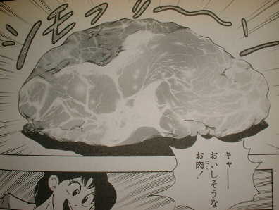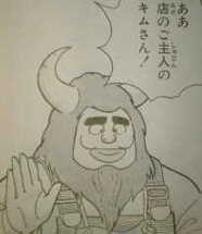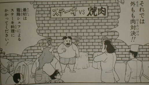 そこに隣のステーキ屋の主人・「ジョー・霜降」さんが怒鳴り込んで来ました。 「お前の店の煙がウチの店内に流れてきて迷惑だ」と すごく怒っています。 高級ステーキ店ぶるんだったら窓開けてねーでエアコンつけろよと思いますし、隣の店の窓に向かって煙を垂れ流しまくりの焼肉店が迷惑だという言い分もわかるので、どっちもどっちだと思います。 しかしゆでたまご先生は片方が善人・片方が悪人、という単純な図式にしないと話を作れないので、ここではステーキ屋が悪人で焼肉屋が良い人です。キムさんは温厚で腰の低いすばらしい韓国人です。やれ差別されるだなんだといって通名を名乗ったりせず堂々とキム姓を名乗っている所も好感が持てます。 どこまでも高慢な態度のジョー・霜降は怒りがおさまらず、キムさんちの家宝の魔法の七輪(なんだそりゃ)を蹴り壊してしまうのでした。なんというひどい典型的悪人。日本人はやはり皆悪党なのでしょうかチョッパリ(語尾)。 その行為についに温厚なキムさんがキレた! 「焼き肉とステーキ! どちらが偉いか料理で勝負しようじゃないか!」 なんでやねん 「どちらが偉いか」ってあんた・・・なんてバカな言いまわしなんだ。本当に大人か。偉かったら煙かけてもOKなのか。偉かったら人んちあがりこんで七輪蹴り壊してもOKなのか。 あ、これはゆでたまご先生が遠巻きに韓国の人をバカにしているのかな。 ゆてたまこ! 謝罪しる! 日本語は濁点か発音しにくいしハングルは世界一優れた文字ニダ! そういうわけで、「牛の外もも肉を使った料理勝負」をすることになりましたとさ。いや、警察呼べよ。器物損壊ですよ。 そしてついにおとずれた料理対決の当日です。 ジョー・霜降が作るのは外もも肉のステーキきのこソースがけ。わあ、硬い牛の外もも肉でも焼き加減をレアにすればやわらかくておいし・・・ってめっちゃ普通。つまらん。死ね! 対するキムさん(というかカンロ)の焼き肉料理は所詮ただの焼き肉なので料理名すらありません。 下ごしらえに工夫した(固い外もも肉を豚の背油でつつんでサーロイン化した)ってだけでした。つまらん。死ね! 「グルマンくん」の分際でその辺の普通の料理マンガと似たような方向性目指してんじゃねえ! そもそも「牛外もも肉を豚の背脂でつつんで作ったサーロイン肉」って、そんなことが可能なのか、もし可能としても美味いのか、食品偽装につながりやしないか、など、いろいろ心配になります。 今回の見所箇条書き ●韓国人にバッファローマンのロングホーンみたいなツノがついています。 モンゴルマンの「焼肉100人前食う」という台詞(超人別主題歌「アジアの狼」より)を合わせて考えると、 一人2000万パワーズと言えます。どうでもよいですね。 ●ジョー・霜降(どこの人だよ)の額に無意味に鉄板が張りついています。いつものことですが。 ●田力雪男はすっかり標準語の解説役が板についています。
