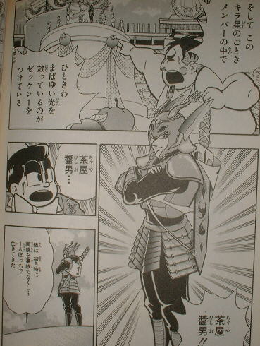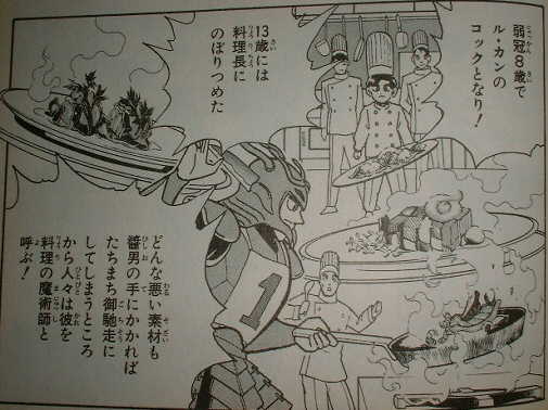 | (続き) その日の放課後・・・ 食井カンロは夕方のグルマン鍛錬もサボり、いつものグルマン御一行と仲良く買い食いしていました。 食井家のお屋敷の向かいにあるハンバーガー屋でハンバーガーをむさぼり食うカンロくんと仲間たち。 過去「そんなに肉が食いたいかー!」とか言って妹ぶっとばしてた田力くんも、美味しそうにハンバーガーをほおばっております。人間変われば変わるものです。 その様子を木陰からコッソリ覗く食井カン太(と松肩)。 「鍛錬をサボり その上ジャンクフードをパクつきおって〜〜〜〜 もぉ・・・許さんぞ〜〜〜〜」 ついにカン太の堪忍袋の尾が切れたのだった! そんなことはつゆ知らず、のん気に友達と別れ 食井家の門をくぐろうとするカンロ。門番が立ちふさがりました! 「ここは食井家のお屋敷! 勝手に入ることはできん!!」 た、たいへんだー! カンロくんが家に入れてもらえません。 自分は当主食井カン太の孫だと主張するカンロ。それでも門番は構わず通せんぼです。 さきほど別れた友人たちも この異変に気づいて戻ってきてくれます。 門番1「しかし本日はこの屋敷内でグルマン・キッズ・レースという催しが行われる」 門番2「もしもおまえがそのレースの参加者ならばここを通ってもよい」 ???・・・ワケがわかりませんが このままでは埒があかない。カンロくんたちは、ウソでもテキトーにYESと答えて門をくぐり、中で何が起こっているのかを確かめることにしました。 するとビックリ。 ![]() 食井家の敷地にそびえる「御馳走タワー」を中心に いつのまにかスタジアムが建設され、その中にザっと数千人(数万人?)の観客がひしめきあい、たくさんの有名な天才少年料理人たちが待ち構えていました。 どうやらカンロは勘当され、空位となった次期当主の座を争う大会が催されることになったらしいです。 さすが食井家。その財力で、カンロがハンバーガー食ってる数分の間に全部そろえたんですね。スタジアムと客と天才少年料理人を。 金の力はすばらしいー! 金があればなんでもできる! いいかげんにしろ。 ところでこの「御馳走タワー」って、食井家を象徴してますよね。文字通り。なんだこのデザイン? 狂ってる。 こんなものすごい労力の1000分の1でもいいので、キナコさんのムコの選別に注いで欲しかったと思います。 ていうか、なんでカンロのオヤジの世代でこういう大会をしなかったんでしょうか。 もう、なにもかもがおかしいです。ワッヒャフハフハハハハハ〜!! もう沢山だ・・・・・・・・・・・・!!! もう こりごりだ・・・・・・・・・・・・!!! 幾度もそう思ったハズなのに――――――――― もうこんなに闘いたい(「グラップラー刃牙」第42巻より) さんざんツッコミ続けてこりごりしている私も、刃牙くんを見習って頑張りたいと思います。まあ↑のセリフ以降主人公の刃牙くんは名前もカタカナで「バキ」と改め、全然戦わなくなってしまいましたがね。最近は青年誌(ヤングチャンピオン)に出張して三日三晩ぶっ続けSEX(初体験で)という荒業を見せて我々を大いに笑わせてくれました。コイツ今(週刊少年チャンピオン2002年37+38号現在)久しぶりに戦ってますけどなんか無性に腹が立つので、柳龍光先生にはがんばってもらいたいと思います。 きみたち! 後楽園ゆうえんちでボクと毒手! ええと、なんで刃牙の話が出てきたんだっけ・・・そう。↑の画像の次ページから、解説の田力さんがライバル紹介してくれるんです。それがめっちゃ「グラップラー刃牙」最大トーナメントの選手入場シーンっぽいんです。1ページ2人。1人1人に大ゴマ1個が割り当てられてるんですよ!まあ今時これはそんなに珍しいことでもないかもしれないですけどちょっと思い出した次第です。 とはいえサスガに板垣恵介先生とは雑誌の待遇が雲泥の差。あまり無茶はできなかったらしく、その紹介シーンはたったの3ページで5人ぽっちです(刃牙は延々17ページ32人)。 少ないから、安心して画像付きで紹介できるね! ![]() な、なんや 著作権って?(オロオロ)