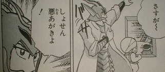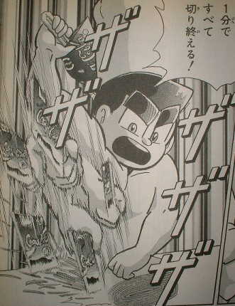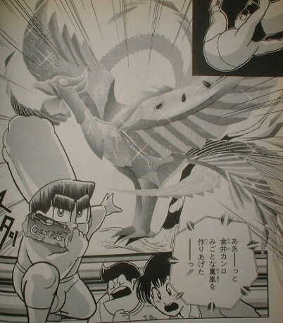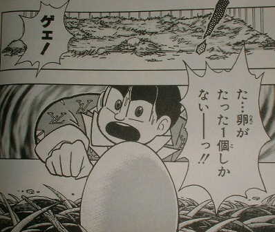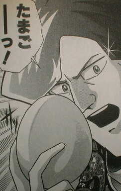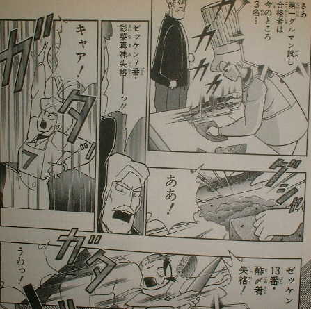 ![]() 続いて我夢正夫くん。包丁の柄についてるボタンを押すと・・・包丁の刃が割れて3枚刃に変形します。 「千切りなんてこれでラクラク―――っ!!」 リクツは全くわからないのですが、難なく「3倍のスピードで」スイカの千切りをこなします。 3倍のスピードだけにとてもアズナブル・・・もとい、リーズナブルな技ですね(おやじギャグ) 「千切りからの菊の飾り切り」「まな板に突き刺さる千切り」 ・・・それらの超絶ワザの次が「3枚刃だから3倍のスピード」とは、なんだかこの我夢くん、めっちゃ地味です。いや、スイカをただ千切りするだけでもスゴイんですけどね。 演出の基本として 地味な合格の仕方ほど先に見せてだんだん派手にしていくべきだと思うんだけどなあ。これじゃあせっかくスゴイのに、全然スゴそうに見えません。不可解ですね。 まあいいや。とにかく我夢くんも合格。これで合格者は3人です。 おおー!? まだこの時点で5ページしか経過していません!!! いつも「前回の続き」話の冒頭はウザい滑り出しばかりだったのに! 今回はうって変わってスピーディーな展開です。 ついにゆでたまご先生も漫画家として進歩する時が来たのでしょうか? ![]() 食井家の世継ぎは男子に限るし、ただの打ち切りでした。 正確には「あと5話でまとめてくださいね」と言われた・・・か。 第13話でわざわざ1人あたり半ページ使ってまで紹介された強キャラ風の二人が なんと1次予選で普通に脱落。 酢〆 肴くん に至っては挑戦シーンさえカットされてしまっています。あわれ! きっと我夢くんも そして酢〆くんも彩菜くんも、もともとはスゴイ合格の仕方をする予定だったんだろうね。 広げ過ぎた風呂敷を もう、これでもかというほど大慌てでたたんでおります。 今回のサブタイトルは「グルマン戦線異状あり」ですが、異状があったのはグルマン戦線というより連載の雲行きでした。 残り時間 ここでやっと食井カンロ(千切りにしたい男No.1)が登場します。 主人公大好きのゆで先生なので 7ページ目にしてやっと主人公が登場する事それだけでも異状っぷりが表れていますね。 そのカンロくんはまだ自分の包丁を探しています。もうダメです。メソメソしてるカンロに追い打ちをかけるように観客からブーイングが飛んできます。 「何やってんだよ天才グルマンじゃなかったのかよ」 「おまえの腕前を見に来たんだぞー―っ!!」 とモノを投げる観客たち。すごい怒りっぷりです。醤男くんと王府くんのあれだけのパフォーマンスが見られたらかなり満足できると思うんですけど、それほどまでに入場料は高かったのでしょうか? 「も・・・もうだめだ・・・・・・」 とあきらめるカンロに、与輪木くんの激が飛びます。