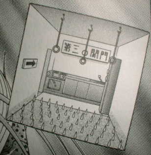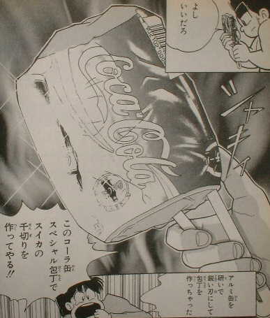 そんな与輪木くんの無責任かつ友情あふるる励ましにより カンロは辛かったグルマン鍛錬を思い出し、包丁がないなら作ればいいんだと思いつきます。 ペロペロキャンディの柄を折り曲げ、それを観客から飛んできた空き缶の口につっこみ、それをこれまた観客から飛んできたデカイ石(危ねぇなあ)でガンガン叩きます。 そいつをテーブル(石製)で砥ぐと・・・