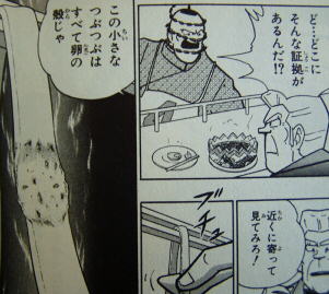 見た目がただのゆで卵であり貧相な天上一しょうゆ染め卵に対して、見るからにゴージャスな純粋卵大王麺は審査員を惹きつけます。 「ボクのほうが先に料理を出したんだよ」と困り顔のカンロ。 いかにも王府くんが悪者っぽい描かれ方をしていますが、王府くんは5分前に調理終了しており、大王麺が先に食ってもらえる方が自然です。むしろカンロは5分もぼんやり待ってくれた王府くんに感謝するべきです。 カンロが虐げられるのは愉快なのですが、いかんせん後出し絶対勝利の法則があるので素直に喜べません。 人生って難しいものですね。 ・・・というわけで、王府くんの純粋卵大王麺が先に試食されることになりました。 まず、山本マズヒロ氏、大絶賛。いつものパターンです.。 なんと、本体の麺はもちろん豚骨スープの染み込んだ冬瓜の器もうまいと来た。やったぜー! 王府くんも「そこまで喜んでいただいて光栄です」と味わい深い不自然な日本語で喜びます。 しかしここで異変が。さっきまで絶賛してた山本氏がイキナリ難色を示しはじめます。 この純粋卵大王麺、卵を大量に使っているハズなのに卵の風味が全くしないそうです。いや、そりゃ普通にダメだろ卵対決なのに・・・ 「小麦粉臭さと豚骨スープの味しか口に残らない」とまで言われてしまいます。うろたえる王府くん。読者も「さっきまでうまいうまい言ってたんじゃなかったのかよ!」と言いたくなる急変ぶりです。 さらに問答は続きます。 「しかも手で打った麺はツルリとなめらかな舌ざわりのはずなのにこの麺はなぜかザラザラしたものが残る」と山本。 「言いがかりをつけるつもりか」と王府。お前こそ何様のつもりだ。もう少し落ち着け。 ここで、さっきまで黙ってもくもく食ってた台所鬼太郎氏が猛ります。 なんと、王府くんが派手なパフォーマンスで卵を割ったあの時、一部の殻の破片が生地に混入していたのです! 台所氏によると、その殻によって卵の風味は壊れ、麺のなめらかさも失われてしまったのだそうです。 いくら弱冠13歳で常人なら20年の修行を要する手延べの技術を持っていても 卵の殻が入っちゃったのに気づかないってのは料理人としてどうなんですか? 応用はできて基本ができないとはこのことです。 そんな台所氏の指摘に対し、 「ど・・・どこにそんな証拠があるんだ!?」と食ってかかる王府。ほんと何様のつもりだ。頼むから落ち着け。