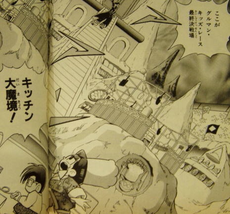 | ついに始まるグルマンキッズレース決勝。一応コレも雑誌に掲載されていたマンガですので、「この回で初めてグルマンくんを読む読者」のために 前回までのあらすじから始まります。 どうせ打ち切りなんだからそんなもの省けばいいのに・・・。 「(中略)包丁試し 卵試しという2大難関にふるいにかけられとうとう2人のグルマン・キッズだけとなってしまった」 ゴホン。 「関門、たった2つかよ!」「なんで包丁と卵やねん!」「たった2関門でたった2人に絞られちゃったのかよ!」 ええと・・・ツッコミはこんな感じでいいでしょうか。なんせ9ヶ月ぶりの更新だから要領忘れちゃいまして。すみません。 いつもどおりのダラダラしたやりとり・つまんねーギャグは省略します。 司会の多田にうながされ、決戦場に向けてごちそうタワーの階段を駆け上る2人。ええと、コイツ何て名前だっけ?忘れた。ひしお?変換できねえ。「醤油男」といちいち書いてから「油」を消せと?めんどくせーもうエビ男でいいんじゃない。そのエビ男が階段駆け上がりながら オレは食井家の世継ぎとして一生何不自由ない生活を送るんだー(意訳) とか言ってます。 毎日朝夕のグルマン鍛錬なんかを強いられる生活はかなり不自由な生活だと思います。 っつーか、お前は今現在一流レストランのオーナーシェフなんだろ? ひょっとして未成年だからとかなんだかんだ理由つけられて薄給で酷使されてるんですか? もしそうだとすると、本当にひどい経営者ですね! 訴えるべきです! まったく、そんな設定をスッカリ忘れるなんて! エビ男が貧乏ってのは過去の設定だろ? 今は貧乏じゃないハズだろ? 少しくらい自分が考えた設定覚えててくれよ、なあ! ・・・あれ?一流レストランを糾弾してたつもりがいつのまにか違う人を責めてた。てへ。なんせ9ヶ月ぶりの更新だから要領忘れちゃいまして。すみません。 長い螺旋階段をのぼり、やっとの思いで第三の食卓にたどり着いた2人の視界に広がるのは・・・