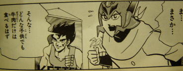 ・・・子ども部屋がキッチン大魔境に早変わりだーっ! ウオォーッ! あの、俺 帰っていいか? 客がいっぱいいるよ?いつのまに?本当に魔境だよ・・・魔境にも程がある。ゲゲゲの鬼太郎妖怪大魔境なんか コレに比べたら魔境のうちに入らない。 そしてなんと、第三の食卓の最終決戦の課題は、 “この極度の偏食少年加内やせ夫くんに大嫌いな牛肉を腹いっぱい食べさせること” だったのです。 名づけて「やせ夫くん偏食直し試し」! いや、伏線とか露骨すぎだから。もうちょっとさりげなく!ネ? ところで、加内家の家庭の事情とかプライバシーとかやせ夫くんの人権とか思いっきり蹂躙されてる気がするのですが、そのあたりは食井家の金満パワーでスカッと解決といったところでしょうか。 こんなことになってもテレビゲームを黙々と続けるやせ夫くん。理由は二つ考えられます。 一つ目の可能性。彼はスゴイ大物である。 二つ目の可能性。それほどまでにブタ肉マンスーパーファイトゲームとやらは面白い。 その疑問を解明するため、われわれ編集部が命がけで入手したブタ肉マンスーパーファイトゲームの貴重なゲーム画面を徹底検証したい。