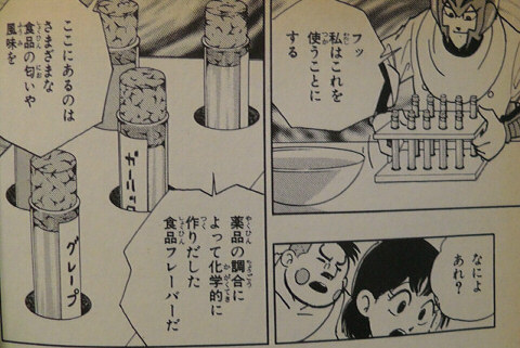 もう卵の話はいい。料理対決、料理対決! ミンチ肉のつなぎとして、やせ夫くんの好物である玉ねぎと食パンを丁寧にみじん切りにしていくカンロ! それに対する高級レストラン料理長、「料理の魔術師」茶屋醤男の一手はっ!? ![]() ドヤ顔で食品フレーバー取り出した!  ̄|_|○ズコー!!!!(2度目)