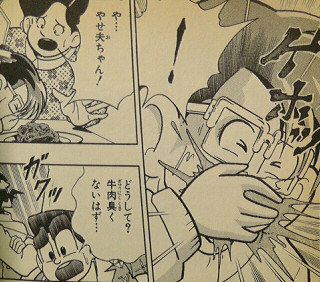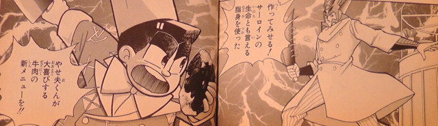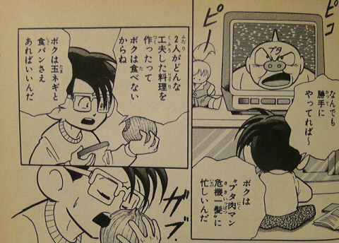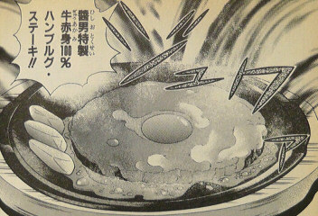 話を19話に戻します。 料理界の誰からも尊敬されている食井家の当主が、自分で作ったルールが気に入らないから途中で改正なんかしたらどうなる?誰からも見放されてしまうぜ! というわけで醤男の反則負けはまぬがれました。でもそういう問題ではなく、“当主に反則とされそうになった内容=贈ったブロマイドが安室奈美でなく茶屋醤男だった”・・・というのが実に狂っています。 もっと踏み込んで、「ルール通りに行くならカンロの料理が吐かれた時点でカンロは脱落」ということにさえ気づいて攻めることができれば醤男の勝利もありえたのですが。残念です。 そしてついに、やっと、最後の戦い“やせ夫くん偏食直し試し”が始まるのでした。残り25ページで調理・試食・判定・まとめを詰め込むことができるのかっ!?がんばれー 調理開始直後、醤男は早速牛肉から脂身を剥ぎとって捨てます。 「脂身も含めて牛肉なんだよ!それじゃあ牛肉嫌いを克服させたことにはならない!(意訳)」、と責めるカンロ。 「脂身が苦手なやせ夫のために脂身捨てて何が悪い!とにかくやせ夫に牛肉を食わせれば勝ちというルールだ!(意訳)」と反論する醤男。 ![]() 2人の天才料理人の主張がぶつかり合い、背景に雷のエフェクトが!激しい料理バトルが始まったでぇーっ! やせ夫くん!やせ夫くんのために!みんなが!こんなに考えてくれてるんだよ! ![]() 「なんでも勝手にやってれば〜(うんたらかんたら)」ピコピーガブ どんな状況でも失わないブタ肉マンに対する異常な執着。嫌いなものは食即吐の異常な偏食。 うん。自閉症だね。疑いようがない。 加内さんはこんな御馳走タワーなんかにいないでしかるべき支援センター等に相談に行くべきです。 あ。「食即吐」は「悪即斬」のイメージで。書きながら今思いついた語ですのでググっても出てきません。 そういえば、かつて16話のレビューで、「この調子で敵キャラ全員ヘボくなっていきます」と書いたのを覚えていますか?覚えてますよね。たった10年半前に書いたやつです。 ヘボくなっていく敵キャラは、ラスボス醤男も例外ではありません。 もろちん、どんなクズ素材でも一流のフランス料理に変えるという設定は最後まで全く生さかれません。 彼が今回作る最終料理は、醤男特製牛赤身100%ハンブルグ・ステーキです。ドイツ語混じりです。 それより何より作り方がひどい。ひどいというかしょぼいというか・・・。 まず、ミンチ作りの段階でひき肉機に頼ります。文明の利器がどうのとうれしそうに使います。“真心込めてオール手作りにこだわるスバラシイ主人公”と対比され、もう味がどうこうでなくマンガ表現としてあからさまにヘボく描かれます。 そして作ったミンチになんやらかんやら混ぜます。