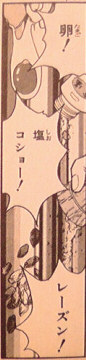 | 「茶屋醤男の反則によってカンロの勝ちーーーっ!!」 しかし、いくら現当主といえども、カン太の独断でカンロの勝ちにはできないのでした。 松肩さんの解説によると、 「このレースの優勝者が食井家の跡継ぎになれるということはテレビ放送を通じて日本全国に知れ渡って」いるのです。 ●食井家の敷地内にそびえる御馳走タワーの周囲に収容人数数万人級のスタジアムを建設 ●グルマンキッズレースを告知し、日本中の有名な天才少年料理人と数万人の観客を集める ●千切り試練に失敗した奴を流すための大量(数万人前?数百万人前?規模が大きすぎてわからない)の味噌汁と設備を作る ●卵料理対決でマズイもの作ったやつを流すための大量(同上)のカレーによる大激流とその設備を作る ●極度の偏食少年とその親をどこからか調達してきて御馳走タワーで日常生活を送らせる ●世継ぎレースについてテレビ放送で日本全国に知れ渡らせる (昔懐かしい11年前に書いた第13話のツッコミを見直しながら箇条書きしました。) これらの所業を1日・・・ヘタすると放課後の1時間弱で用意してのける食井家。アラブの石油王何人分の財力があるのか知りませんが、卵料理対決で使う卵くらい用意しろや! まて。卵?なんで卵のことを今つっこんだんだ俺。無意識にやってしまった。 卵・・・何の話でしたっけ・・・おさらいせねば。 ![]() 「た・・・卵がたった1個しかないーーっ!!」 たしかコレが15話の「卵試し」開始直後の様子でした。この絶望的状況から、たった1個の卵でなんとか切り抜けたんでしたね! そして18話の暴走予行演習サーロイン・ソース天ぷらで・・・ ![]() 「まず小麦粉の薄力粉!」「卵!」 卵あるじゃねえかボケいいかげんにしろ!卵用意しておけ!していた!たった1個しか無かったんじゃないのか!使いきったんじゃないのか!覚えとけ!「クリクリ」じゃねえよ!このド低脳がァーーッ! といった乱暴な言葉はグッとこらえてこういう場合 卵あったんだね!見つかってよかったね!と言わないといけないんです。世知辛い世の中です。よくミスって保護者からクレームが来ます。