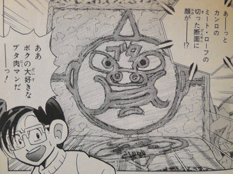 どうして、両方とも美味しい!どっちが勝つんだ?という展開にできないのでしょうか。最終話まで「敵の作ったのはマズイ」って・・・ 「ボクはやっぱり牛肉は食べられないよ・・・」と悲痛な表情を浮かべるやせ夫。 そんなやせ夫くんに、カンロは自分のミート・ローフを切って見せます。 ![]() 「ああ ボクの大好きなブタ肉マンだーーーっ!」 なんやらかんやら小細工(前ページ参照)の正体はこれでした。あいかわらずものすごい技術です。 「うわーーおいしそう!」ブタ面を見てわきあがる食欲! みごとカンロは、自閉症児・やせ夫くんのどんな状況でも失わないブタ肉マンに対する異常な執着から切り込むことに成功しました。 そういえば「魚の匂いを嗅ぐだけで嘔吐するので魚系の給食は全返却&給食当番はおかず系の役割にならないよう配慮」が必要な自閉症児が、魚の匂い充満しまくりんぐのかまぼこ工場見学では「校外学習楽しいな」の気分により魚の匂いに気づかず全然問題なく過ごすことができて、なんだそりゃお前大丈夫じゃねえか、と思った経験があります。自閉症の描写だけがリアルすぎます。 そしてカンロ特製牛脂刻み入りびっくりミート・ローフは食通・加内やせ夫審判長(6)の大絶賛をいただきます。 解説の田力氏も、これでもかとばかりに的確な解説をねじこんできます。