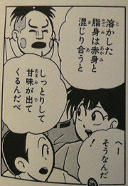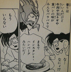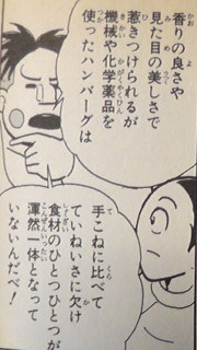 | 「それではただ今よりやせ夫くんに試食をしてもらう!」 いち自閉症児に託される、食井家の命運! 醤男は脂身を使ってないことと玉ねぎ食パンの匂いたっぷりなこと(笑)をアピール、 カンロは本物の玉ねぎと食パンを使っていることをアピールし、われ先に食べてもらおうと必死です。 結局、「カンロの料理にはキミの嫌いな脂身が入ってるからやめとけ」的な醤男の卑劣な誘導(醤男くんのセリフ・残り2)により、醤男特製牛赤身100%ハンブルグ・ステーキが先に食っていただけることになりました。 おそらく先に食わせた(=先に偏食をなおした)方が勝ちのルールだから、その行動は間違っていないんだけれど・・・・・・後出し絶対有利の法則・・・ そして、醤男くんの料理を一口食ったやせ夫くん(6)のコメント ![]() 「香りはいいんだけど(うんたらかんたら)まるでインスタント・ハンバーグみたいだ!」「もういらない」 ゲー!食通! 「まるでインスタント」って・・・本物もインスタントもお前には関係ないだろ!?っつーか食った経験ロクにないんだからそんなのお前にはわからんだろ!? といった数々の不条理に対する納得いかない心情が全て醤男くんのセリフ「な・・・なにィ!?」に凝縮されています。(醤男くんのセリフ・残り1)
