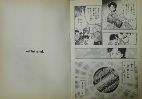 ●キャラ紹介の過去描写シーンの時点でグルマン・キッズ・レースのゼッケンをつけていたり(しかも1を)、 ●卵試しの際には究極の卵料理を作ることもあるかと予想しガチョウの卵のカラをあらかじめ用意していたり、 ●たくさんの食品フレーバーを用意していたり(これはキッチン大魔境にあったのかもしれんが)、 ●懐に情報買収用の茶屋醤男ブロマイドを用意していたり、 と、宇宙の真理が歪むレベルでありえないほど入念に今回のレースの準備を進めていた、誰よりも「食井醤男」になりたかった男の無念がこの少ない文字数に凝縮されてると思うと感慨深いです。 最後のページはまさにやり逃げ。 食井カン太からカンロへ黄金のシェフ帽が贈られるだけです。なんだその悪趣味な帽子。まさに金満食井家の象徴です。 ゆかいなツッコミ所もなんにもなく、もう、「最初ッからお前ら身内だけで勝手にやってろ」としか言いようがないどうでもいいやりとりで、 あれだけいたはずの観客の拍手もまばらです。よく暴動が起こらなかったものです。 最後は何か聞いたことのある(&よく聞く)、いいセリフっぽい格言で無理矢理締めます。読者は全てを諦めます。 ![]() ・・・the end. 以上、これでグルマンくん全話紹介を終わります。 ![]() 今(2013年11月現在)の神がかったゆでたまご先生になら、ぜひグルマンくんの続編を作っていただきたいですマジで |