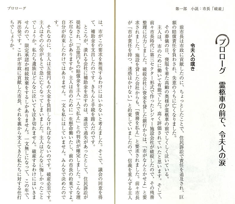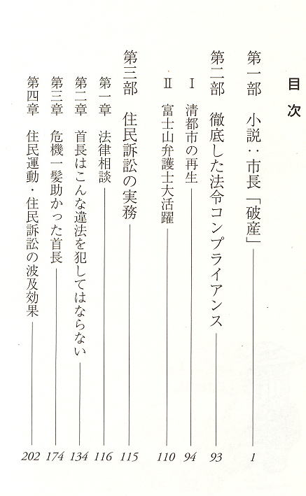 この本の第一部は92頁の「小説 市長破産」です。内容は、市民を裏切って、公金を組合のために浪費・流用している中部地方の清都市(すでに汚濁市になったが)を舞台に、住民訴訟でその違法の是正に努める住民運動家草の根強子たちと弁護士冨士山家康が下級審で勝訴したのに、、議会の権利放棄議決有効の最高裁判決で挫折しつつ、なお食いしばって、最終的には権利放棄議決無効、市長に賠償責任を負わせて、違法行政を一掃し、我が国は違法行政放置国家から法治国家に前進したという話です。ある程度は現実にあった闘いを借り、ある程度は今後の希望です。第二部は、徹底した法令コンプライアンスと新しい施策、第三部は、法律相談の形で住民訴訟を解説したり、首長が、住民訴訟で責任を問われたり、間一髪〔かなりは司法の腐敗のために〕責任を問われずに済んだという事例の解説です。全体として新書版で208頁です。
