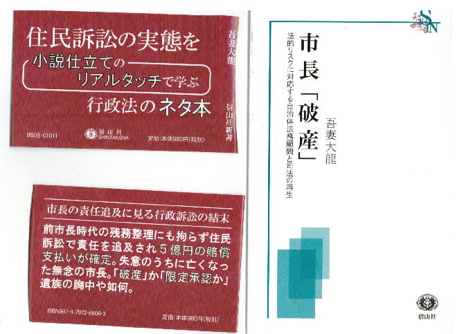 小生、このHPの冒頭で小説家を目指す?と称していましたが、念願かなって、小説家? 吾妻大龍として、「市長破産」を信山社から出版して頂くことができました。