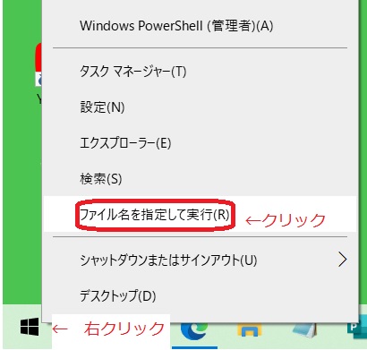 左下「田」右クリック「ファイル名を指定して実行」をクリック