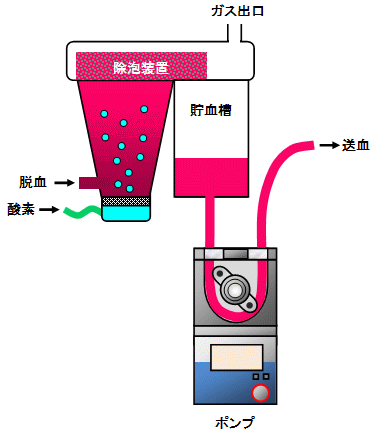回路構成 : 脱血→気泡型肺→貯血槽→ポンプ→フィルタ→送血