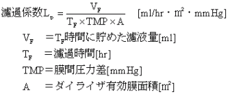 ≪溶質透過性能≫ @ クリアランス 定義 : ダイアライザ内の透析液に含まれない溶質の移動を表す指標。単位はml/min 限外濾過=0の場合 限外濾過≠0の場合 A ダイアリザンス 定義 : ダイアライザ内の透析液に含まれる溶質の移動を表す指標。単位はml/min ≪透水性≫ @ 濾過係数 定義 : ダイアライザの透水性を表す指標。 A 限外濾過率(UFRP) 定義 : ダイアライザの透水性を表す指標。 ≪溶質分離特性≫ @ ふるい係数 定義 : 限外濾過による溶質の膜透過効率を表す。 SC=1 その溶質は水分とともに完全に濾過される。低分子量物質 血液透析における溶質コントロールの指標(至適透析)@ 週間平均BUN (TACBUN : Time Averaged Concentration of BUN) 定義 : 透析による濃度低下と非透析時の尿素産生による濃度上昇を繰り返すBUN値の平均。 コントロールの基準 : <6.5mg/dl A 蛋白異化率 (PCR : Protein Catabolic Rate) 但し、栄養状態安定(正味の組織蛋白崩壊量=0)なら、PCR=蛋白摂取量となる。 B KT/V 標準化透析量 透析の治療量を数学的に表現したもの