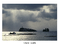 脇野沢村には「鯛島(たいじま)」といって,鯛の形に見える島があります。この鯛島には,一つ の「悲恋物語」があります。坂上田村麻呂という平安時代の将軍が蝦夷征伐の際に,この村にしばらく 逗留したときの村の娘との物語です。まあ,偉い男というのは,昔も今も勝手なもののようで,この 田村麻呂は村の娘とねんごろになった後,娘を見捨てて都に帰ってしまうのですね。残された娘は命を 絶ってしまい,その後,海蛇の姿となって海を荒らすという言い伝えです。