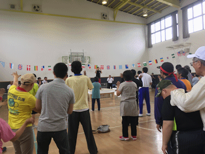 準備体操(左の写真)で大汗をかいた後、仮想じゃんけんリレ