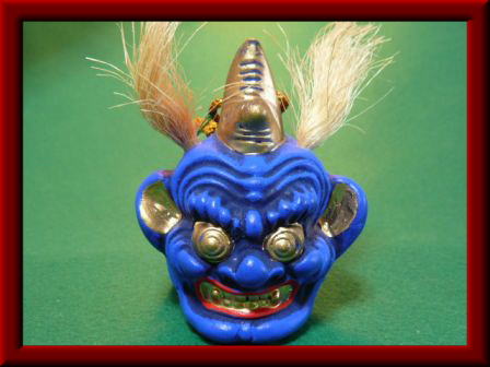 | 民芸六郷山房 虎熊 佑 作 | 国東半島では修正鬼会(しゅじょうおにえ)のことを「しゅじょおにお」と呼んでいる。これは国東における天台寺院の年頭行事はじめで、修正会(正月会)のことである。 修正会は追儺(ついな)ともよばれ、この儀式は約千三百前朝廷で行われ、吉祥天悔過(けか)・鬼やらい・厄払い・厄落し・鬼走りとなり、薬師悔過とならんで古代仏教の重要な行事とされ、自己の罪障を懴悔する法会である。その後これらの儀式は次第に農耕祈願となり、年頭の招福攘災祈念の行事となった。 国東では仁聞菩薩が寺院を開基したと伝えられる養老二(718)年以来、天台寺院のほとんどで異国降伏・国家安泰・五穀豊穣・無病息災を祈って行われきたが、いまは三ケ寺で古式を伝えて行われている。この修正鬼会鈴は行事につける鬼会面を形どったもので、魔除け・災難除けとされているものである。敬白 民芸六郷山房 虎熊 佑 作 |