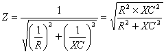 、 で抵抗と容量性リアクタンスを表し、合成インピーダンスは で計算することができます。 |