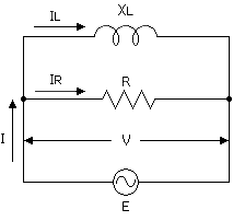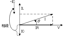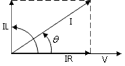 並列回路の場合、直流回路の場合と同じく、各素子にかかる電圧は同じであるので回路の電圧 V を基準にして 考え、IR と IL 、及び I をベクトルで表します。