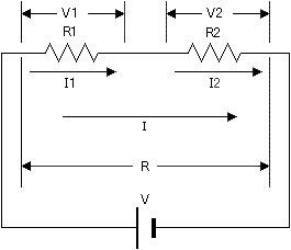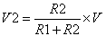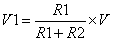 V = V1 + V2 (V1 とV2 はそれぞれ抵抗R1 、R2 にかかる電圧)となり、それぞれの抵抗にかかっている電圧は全電圧を抵抗値の比率によって分けた電圧になります。
