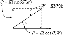 無効電力は機器によって消費されず、機器と電源とで往復するだけの電力であり、単位は(var:バール)を用いる。 |
