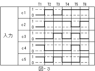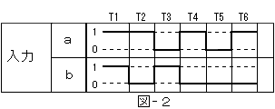 ゆえに、図-2の入力波形から考えた場合、T1=「0」、T2=「1」、T3=「1」、T4=「1」、T5=「0」、T6=「1」となり、これを出力波形に対応させると「c2」になります。
